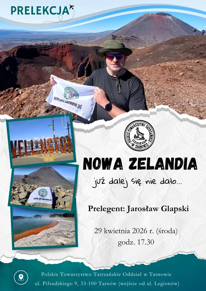Prelekcja pod tytułem „Nowa Zelandia. Już dalej się nie dało…” odbędzie się w środę, 29 kwietnia, o godz. 17.30 w siedzibie tarnowskiego Oddziału PTT przy ul. Piłsudskiego 9, z wejściem od ul. Legionów. Polskie Towarzystwo Tatrzańskie w Tarnowie zapowiada wieczór dla tych, którzy lubią opowieści o dalekich wyprawach, odległej geografii i miejscach, do których nie dociera się przypadkiem.