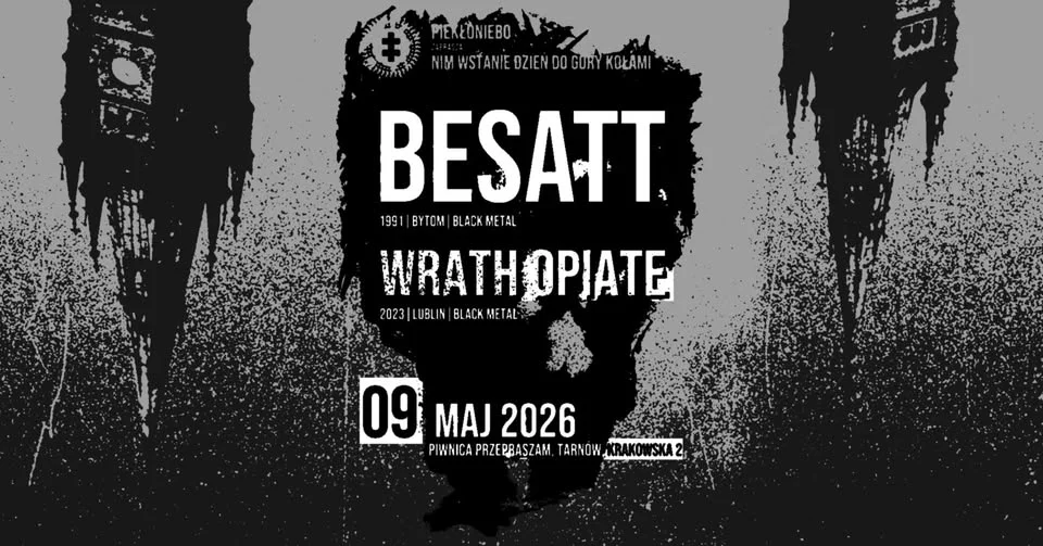 Tarnów szykuje się na mocny, mroczny i bezkompromisowy koncert — BESATT wraca z pełnym ciężaru blackmetalowym rytuałem, a do tego dołącza świeża, lubelska energia od Wrath Opiate. Jeśli kręcą Cię intensywne granie, ciemny klimat i koncerty, które zostają w głowie na dłużej, to ten wieczór może być właśnie dla Ciebie.