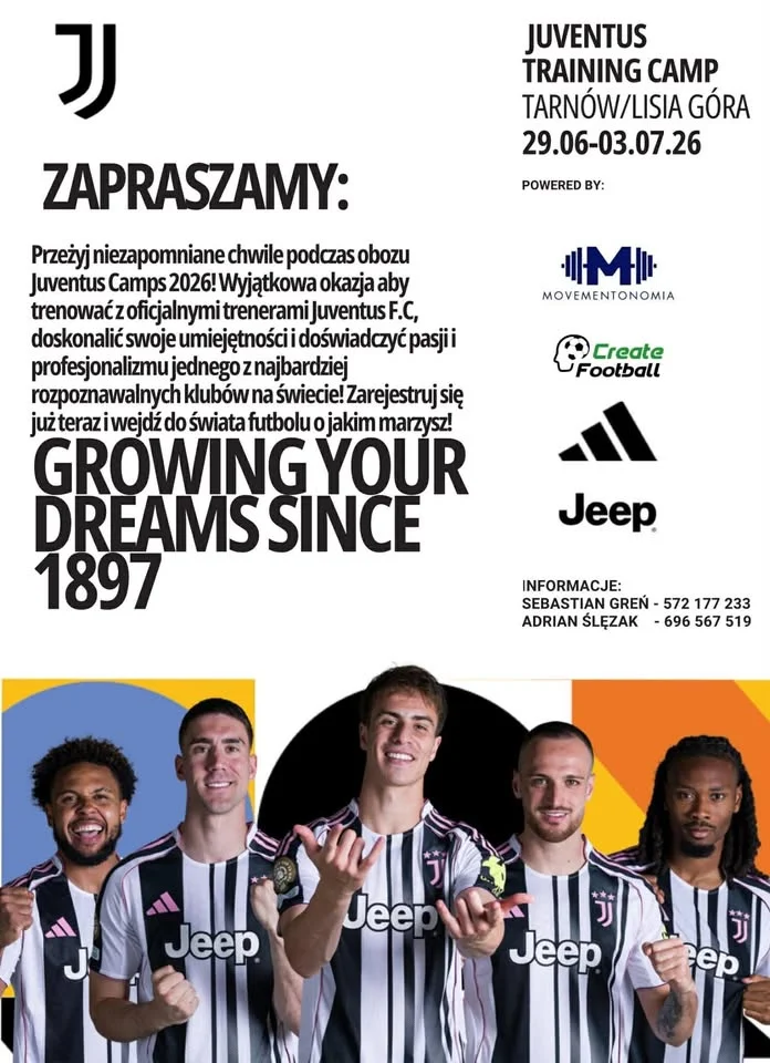 Informacje o cenie i zapisach: w oficjalnym ogłoszeniu nie podano szczegółów finansowych ani linków do rejestracji — zapisy i szczegóły organizacyjne prowadzą organizatorzy: MOVEMENTOnomia, 365sport.pl oraz Creative Football we współpracy z Juventus Turyn. Liczba miejsc ograniczona.