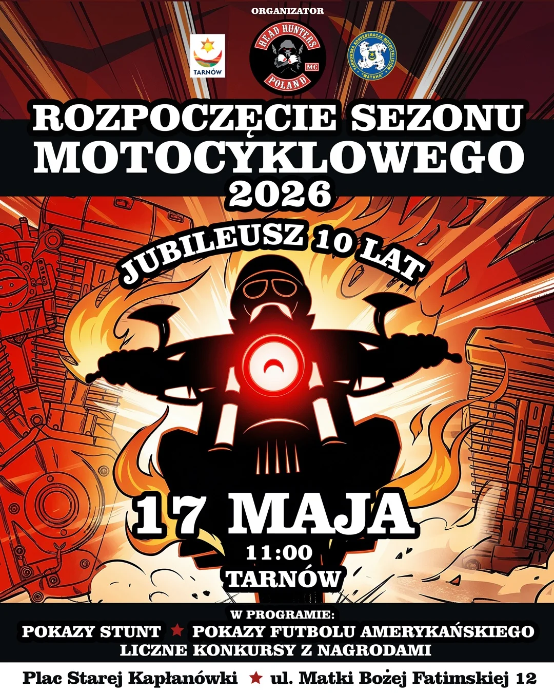 W Tarnowie znów będzie głośno, motocyklowo i bardzo energetycznie Rozpoczęcie Sezonu Motocyklowego Tarnów 2026 wraca w jubileuszowej, 10. odsłonie, więc można spodziewać się wspólnej jazdy, spotkania pasjonatów i świetnej atmosfery od pierwszych minut. To jeden z tych miejskich momentów, kiedy dwa kółka naprawdę przyciągają uwagę — warto tam być.