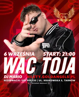 W sobotę 6 września w klubie Gold Angels w Tarnowie odbędzie się koncert Wac Toja. Artysta zaprezentuje znane przeboje i imprezowy repertuar, a wieczór uzupełni DJ Mario. Impreza zaplanowana jest na godzinę 21:00 i potrwa do rana. Organizator przewiduje dodatkowe atrakcje klubowe, pakiety rezerwacyjne oraz promocje dla grup.